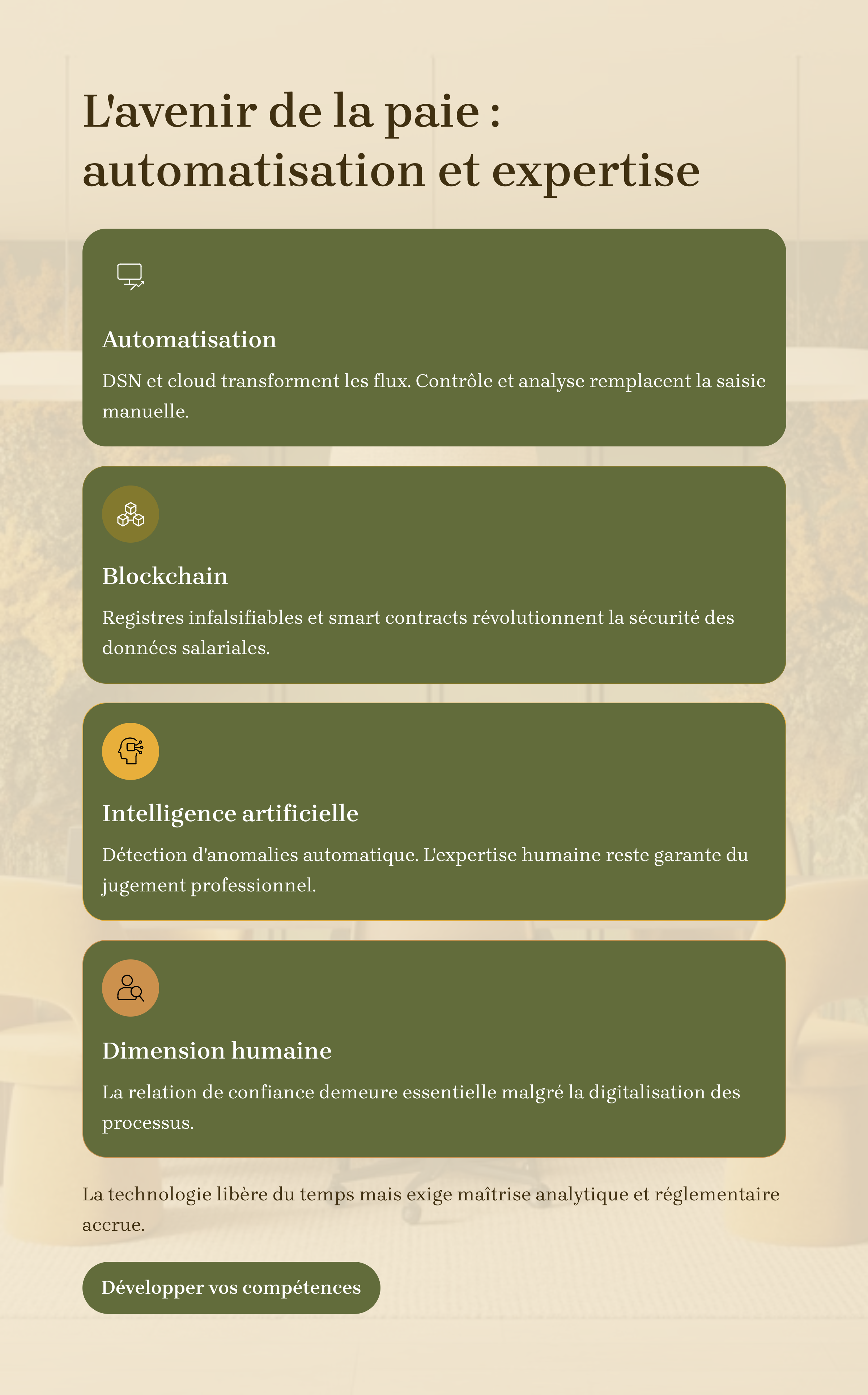 Au-delà de l'IA, d'autres technologies commencent à frapper à la porte de la paie. La blockchain promet de sécuriser les données salariales et de créer des registres infalsifiables des historiques de paie, particulièrement utiles pour les travailleurs mobiles ou internationaux. Certaines entreprises expérimentent des smart contracts qui automatiseraient le versement de primes dès l'atteinte d'objectifs vérifiables. Les APIs ouvertes facilitent l'interconnexion entre logiciels de paie, outils de GTA, SIRH et banques, créant des écosystèmes intégrés où les données circulent en temps réel. Le paiement instantané pourrait transformer le rythme mensuel traditionnel : pourquoi attendre la fin du mois quand le salaire pourrait être versé quotidiennement ou à la demande ? Ces évolutions soulèvent des questions inédites : comment gérer les cotisations sociales en flux continu ? Comment maintenir la conformité DSN avec des cycles de paie fragmentés ? Le gestionnaire de demain devra comprendre ces architectures techniques, dialoguer avec des ingénieurs logiciels, et anticiper les impacts réglementaires de technologies qui n'existaient pas lors de la rédaction du Code du travail. Loin d'être de la science-fiction, ces innovations sont déjà testées dans certains secteurs. Rester informé de ces tendances devient un atout stratégique pour ne pas subir les transformations mais les accompagner activement.