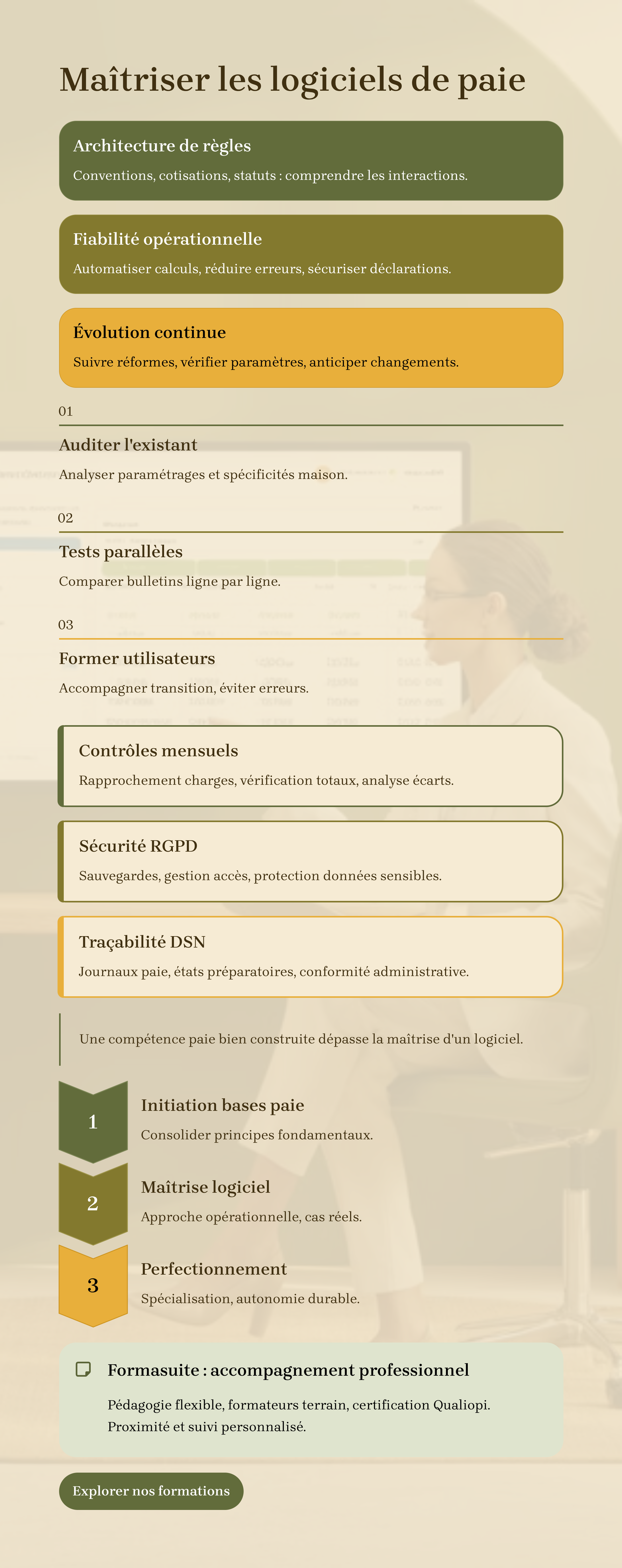 La maîtrise technique d’un logiciel prend tout son sens lorsqu’elle s’appuie sur une compréhension solide des principes de paie. Il est souvent utile de consolider ces bases en suivant un parcours dédié à l’initiation et aux fondamentaux de la paie avant d’aborder un niveau de perfectionnement et de spécialisation. Ces progressions permettent de relier l’outil à la logique métier : lire, interpréter, sécuriser. Une compétence de paie bien construite dépasse la maîtrise d’un logiciel ; elle s’en sert pour fiabiliser toute la gestion sociale de l’entreprise.