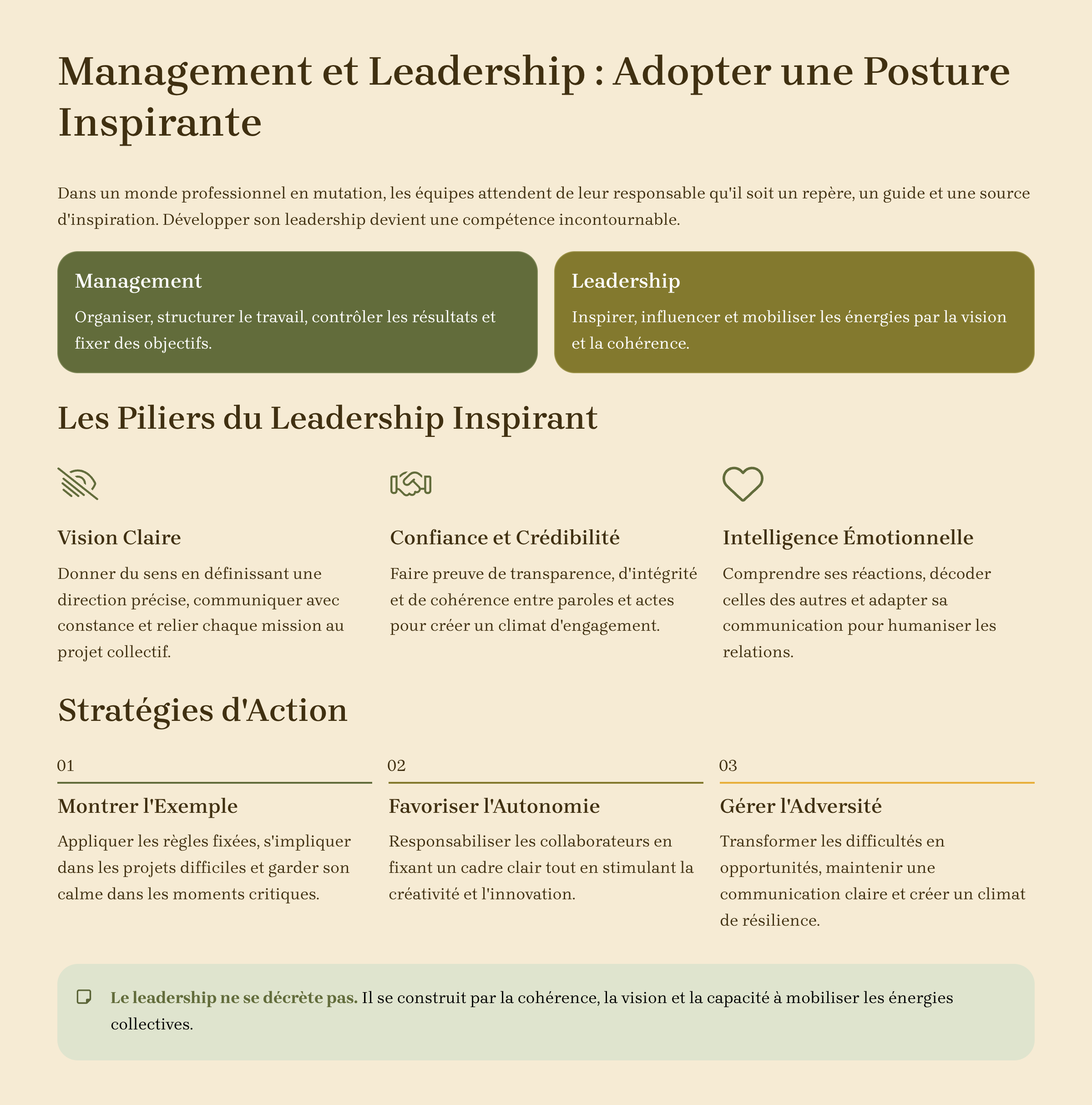 Le leadership ne se décrète pas. Il se construit par la cohérence, la vision et la manière de mobiliser les énergies. L’idéal est de créer un équilibre où les compétences managériales structurent l’action, et où le leadership insuffle une dynamique collective.