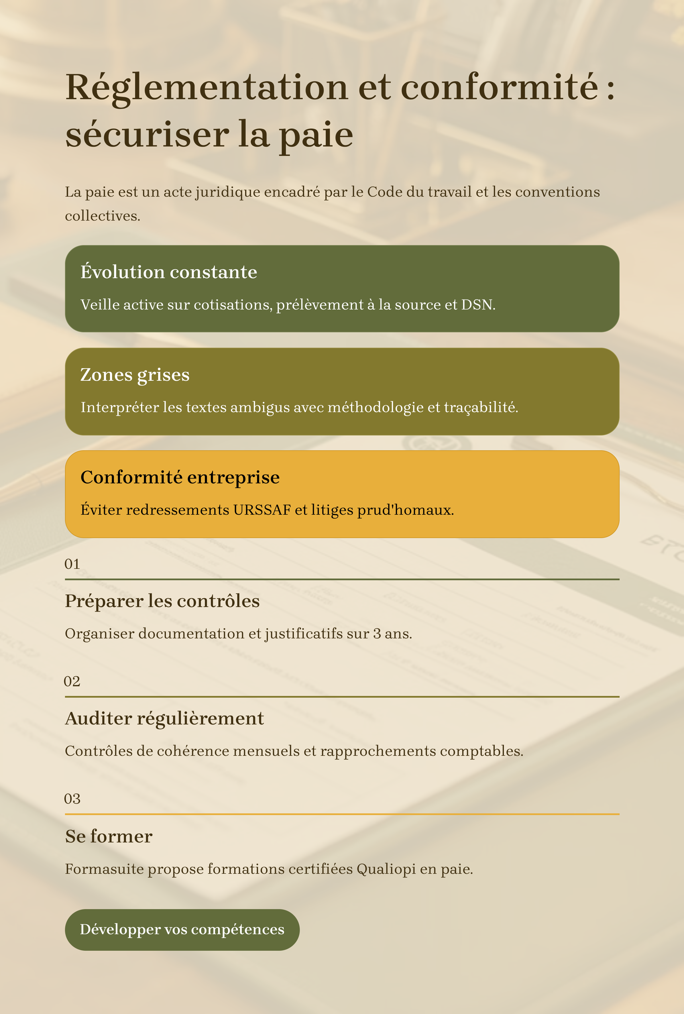 La paie ne se résume pas à un calcul : c’est un acte juridique. Chaque ligne d’un bulletin reflète une obligation légale encadrée par le Code du travail, la Sécurité sociale et les conventions collectives. Dans un contexte où les réformes s’enchaînent, maîtriser les règles devient essentiel pour éviter les erreurs, les contentieux et les redressements. Pour renforcer vos compétences sur ces aspects, vous pouvez développer vos compétences en gestion de la paie avec Formasuite.